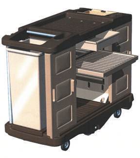 DELUXE LODGING CART offers center wheel design for 360 degree turning radius, ergonomic aluminum handles for maneuvering cart, vacuum cleaner ledge and handle, notch with built in tool holders, pockets for standard cleaning items, drawers for holding soap, shampoo, etc., door with lock and key.